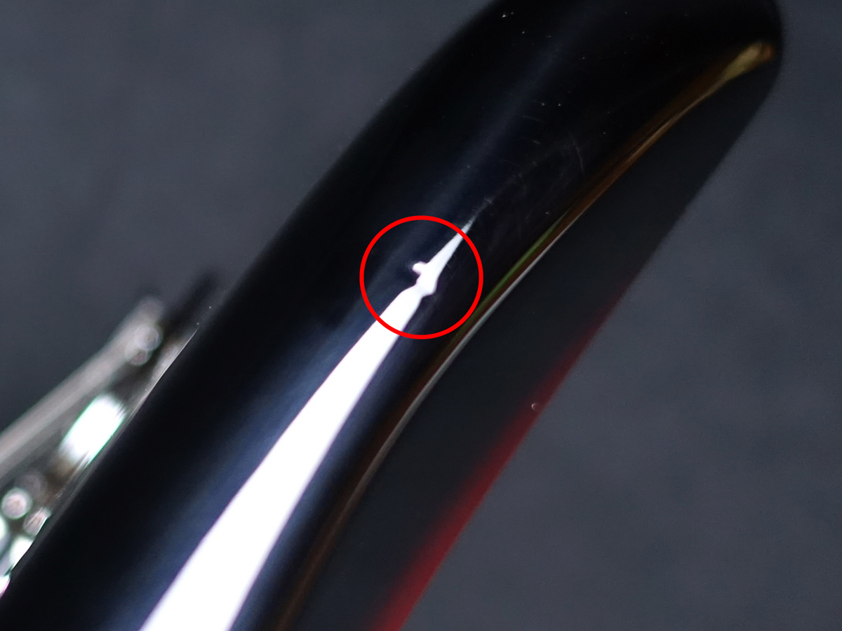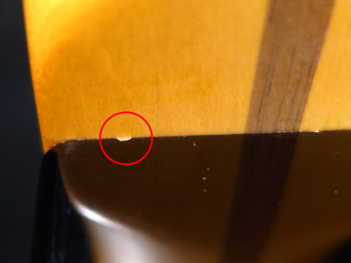 ※6弦側ボディサイドに凹凸を伴う打痕、ボディジョイント付近に塗装欠けが見受けられます。