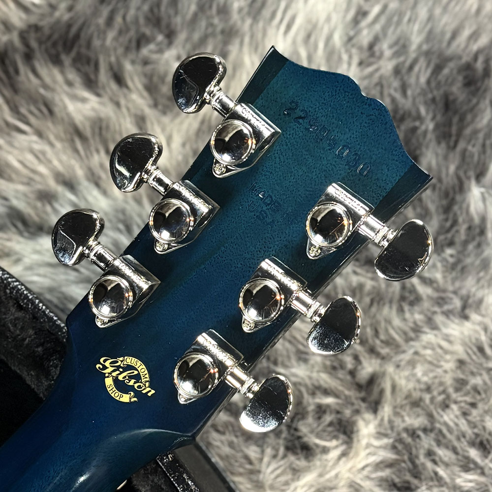 ボディからヘッド裏に至るまで全身ブルーボネットカラーを採用。スプルースとマホガニーの地の色による表情の違いがとても美しいです。