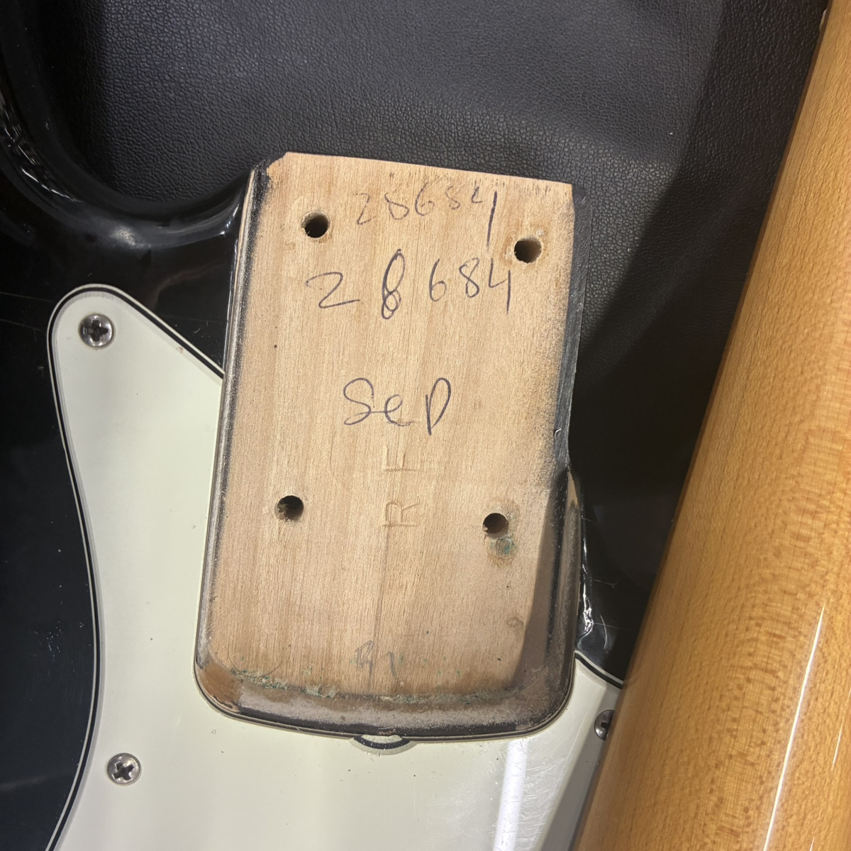 特筆すべきはその外観であり、元々レリック加工の施されたモデルかとは存じますが、腕や体の当たる箇所はその他に比べて非常に細かくクラックが生じており、とても説得力のあるルックスとなっております。ブラックのボディとホワイトガードのモノトーンルックも間違いない組み合わせです。