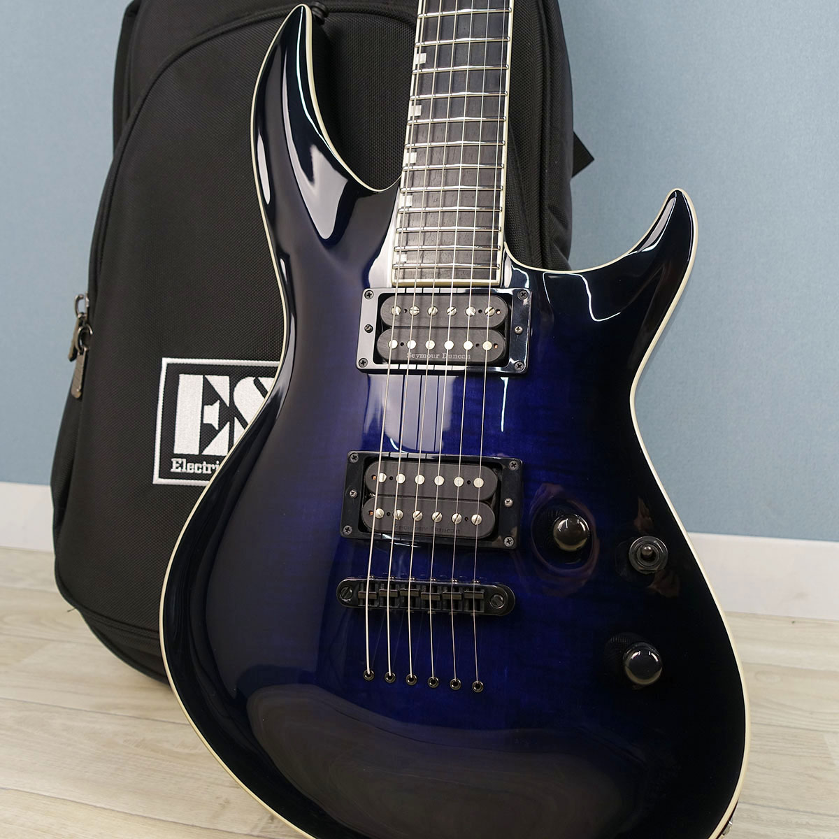 フレイムメイプルトップにアルダーバックのボディ、3ピースメイプルのスルーネック、エボニー指板というマテリアル。