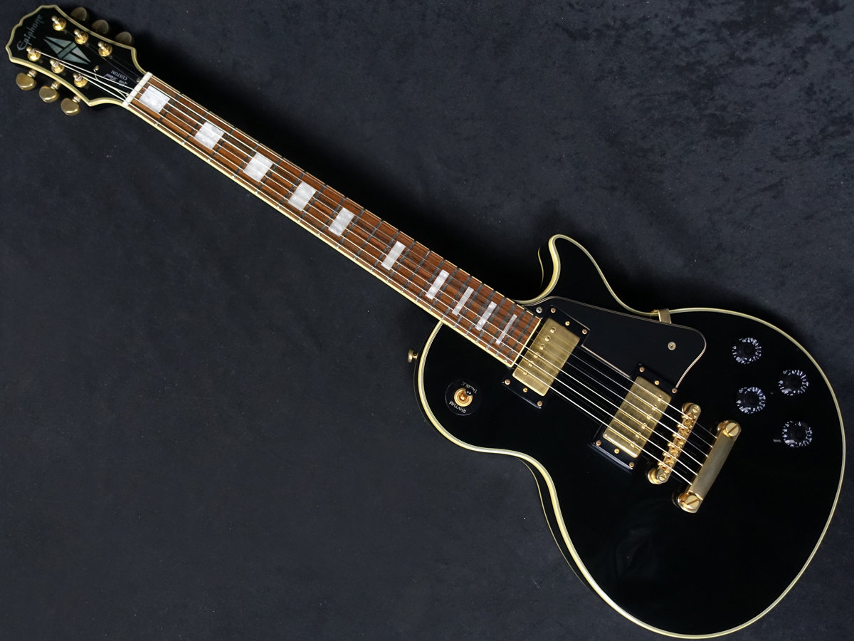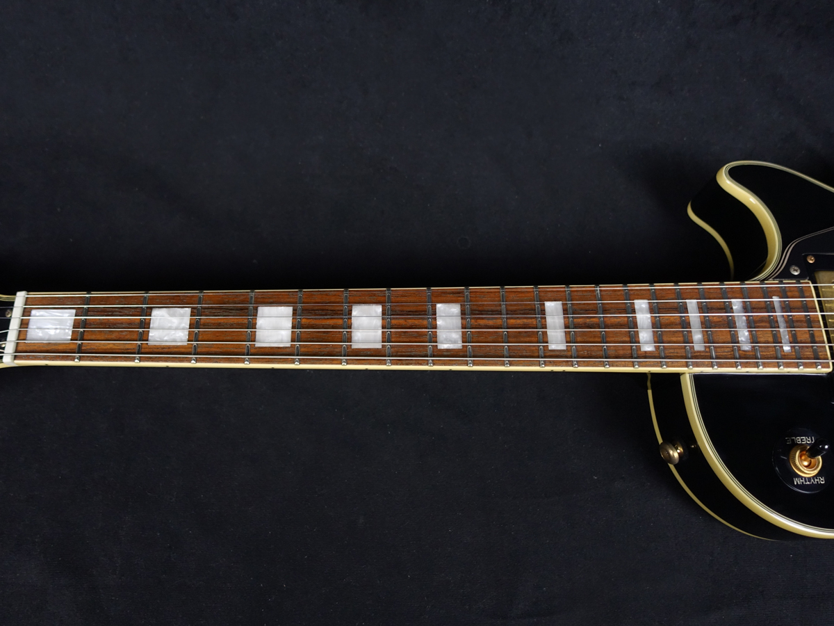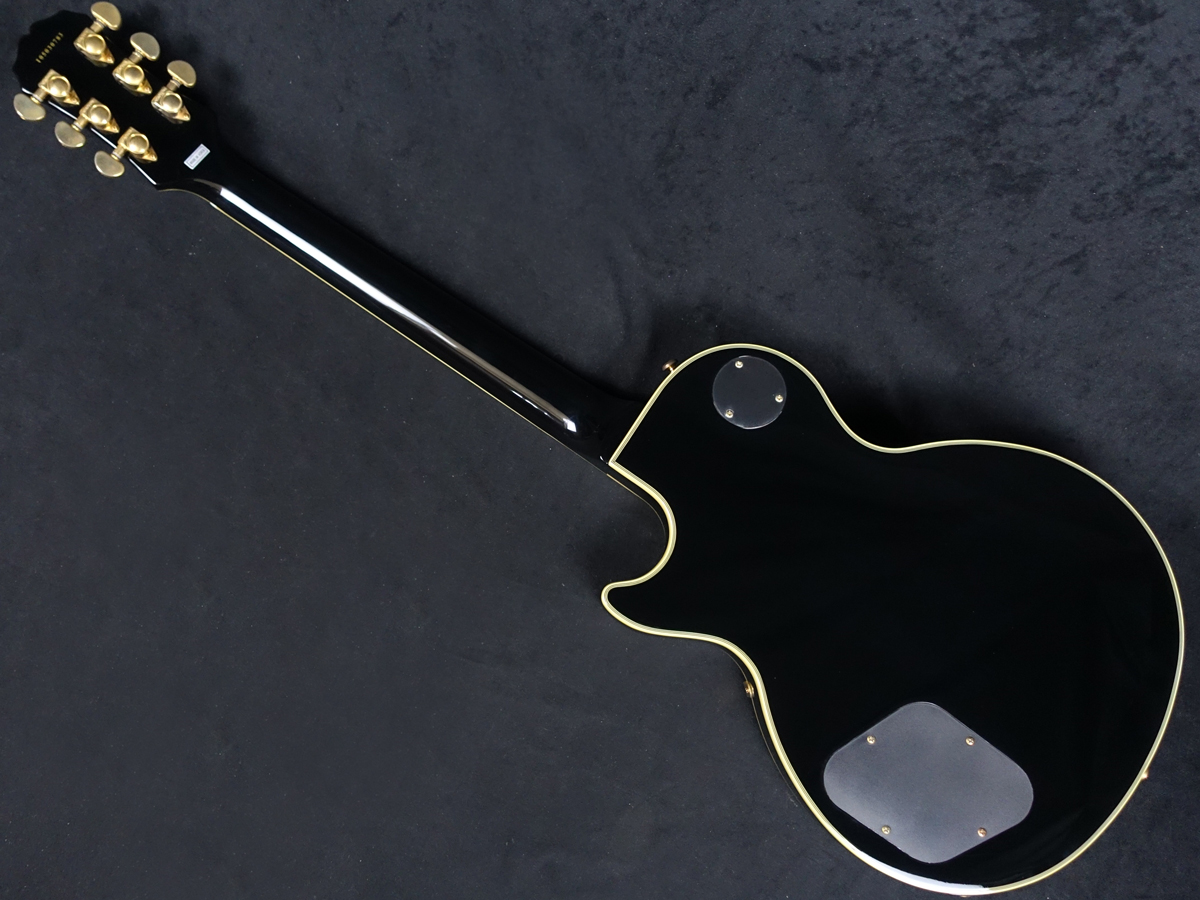 精悍なエボニーカラーのフィニッシュにダブルバインディング仕様、ダイヤモンドスプリットインレイ、ゴールドハードウェアなど、レスポールカスタム特有の高級感あふれるルックスが魅力です。