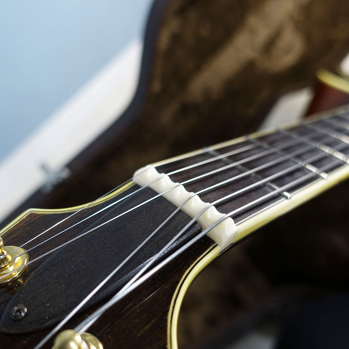 スキャロップド・ナット仕上げとなっており、各弦の分離感を求めた形状となっています。整形や溝のコンディションは問題なくきれいに仕上がっています。