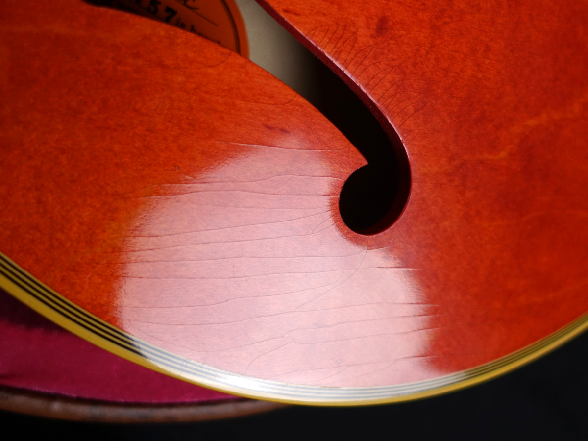 経時変化によりウェザーチェックと呼ばれるクラックを生じさせる、1950年代、1960年代のニトロセルロースラッカーを科学的に解析し、その変化のプロセスをひも解き、あらゆるモデルのプロトタイプによるテストを重ねて、ヴィンテージ同様のナチュラル・ウェザーチェックを再現するラッカー・プロセスを開発しました。