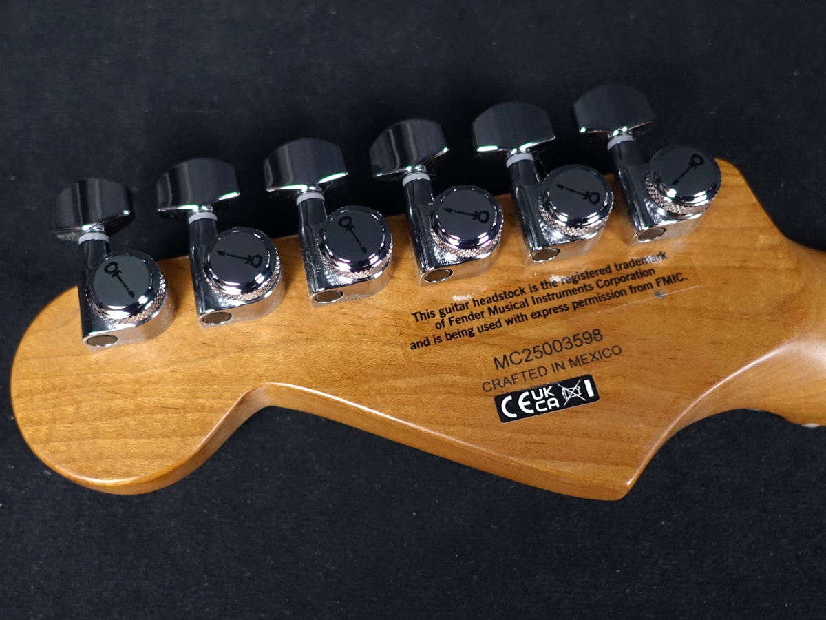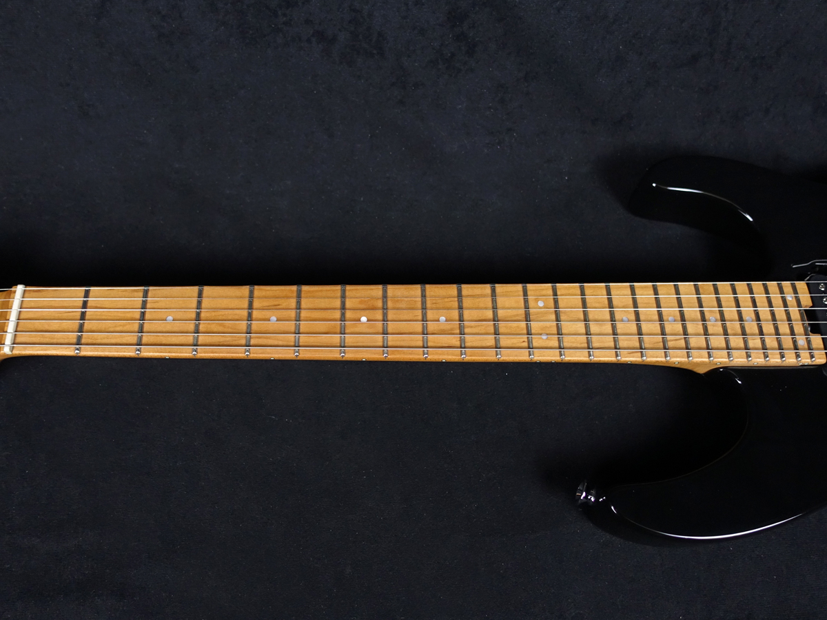 12〜16インチコンパウンドラジアス仕様のキャラメルメイプル指板には、快適なエッジ処理、24本のジャンボフレット、パーロイドドットインレイ、Graph Tech TUSQ XLナットが採用されています。