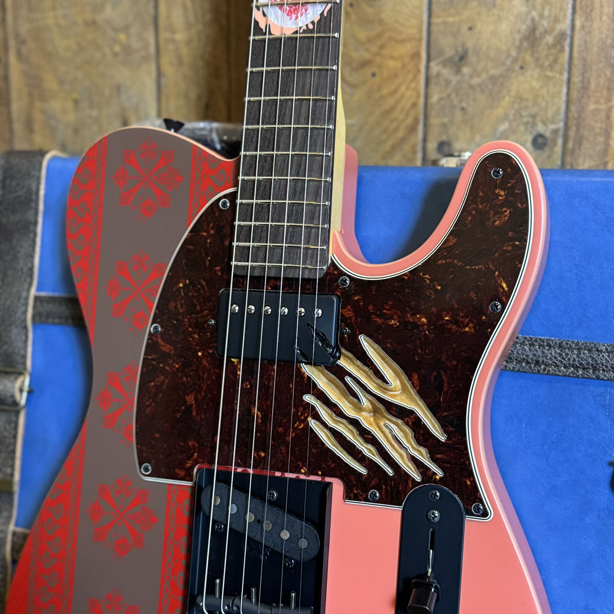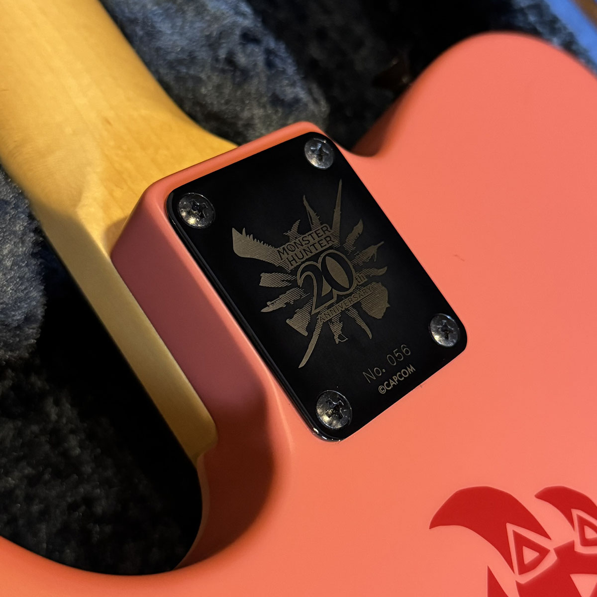 Fender Flagship Tokyoおよびフェンダーオンラインショップで限定販売された本機『Limited Monster Hunter Rathalos Telecaster』は、ピックアップカバーとピックガードを貫通するリオレウスの爪痕が表現されているほか、ネックの裏側にもリオレウスの羽の模様が刻印されています。