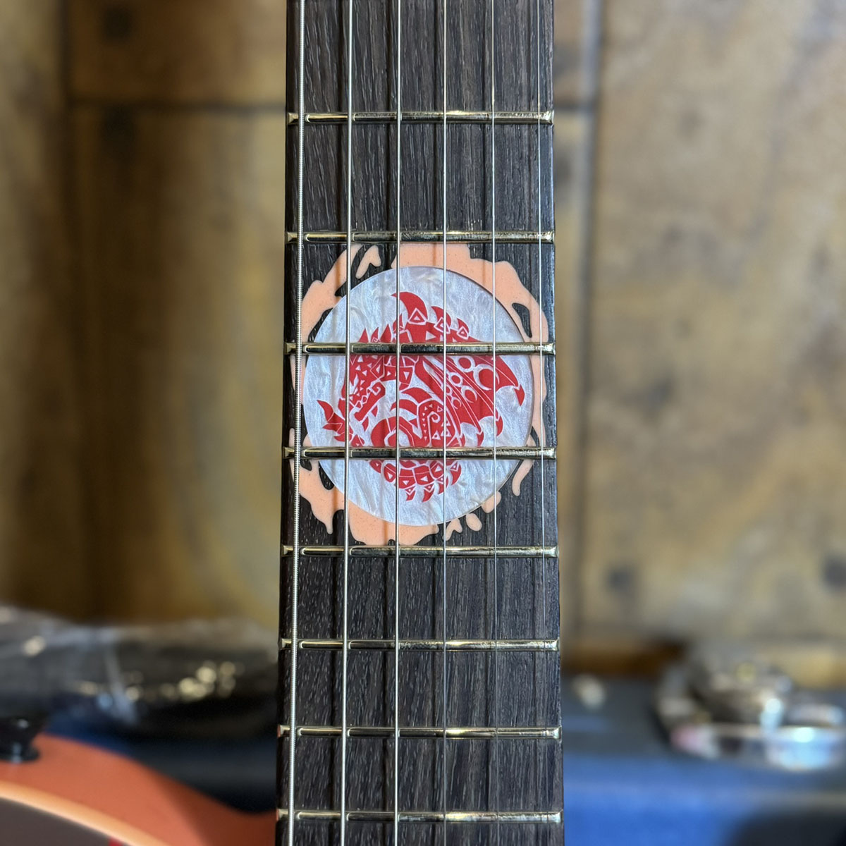 リオレウスを表現したオリジナルのカラーリングやピックガードの素材、全てブラックで統一したハードウェアなどにも拘った、唯一無二のギターです。