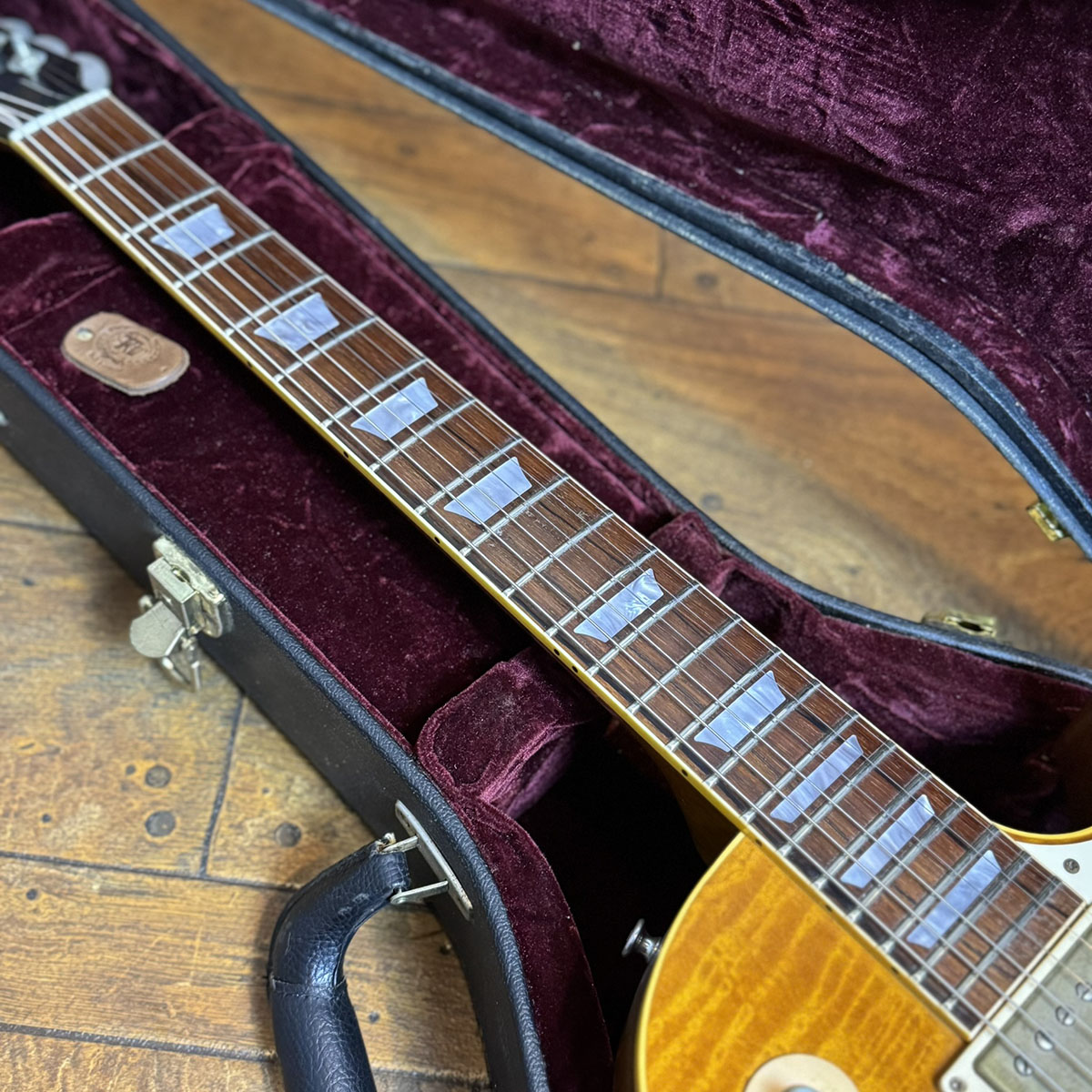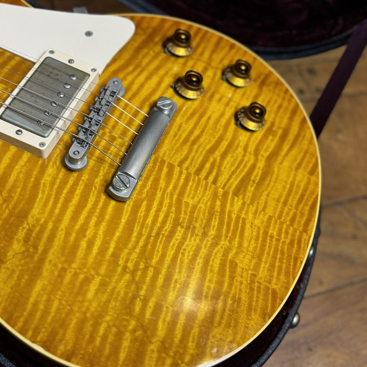 1958レスポールながら目を見張るほどの素晴らしいフィギュアドトップを備え、デフォルトでGrover Tunerを搭載した嬉しいスペックの1本です。
