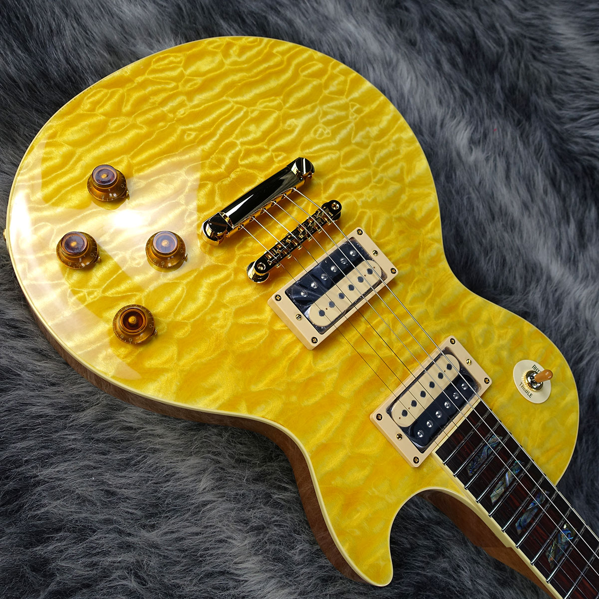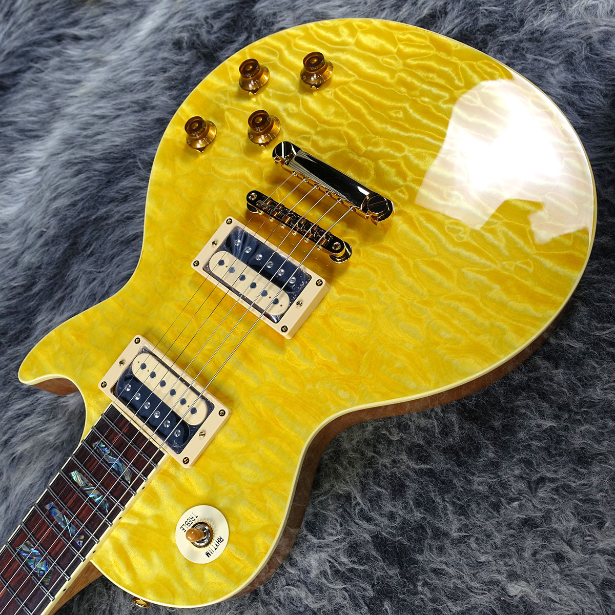 美しい杢目のキルトメイプルトップ、マホガニーバック、1Pマホガニーネック、ローズウッド指板のウッドマテリアル。