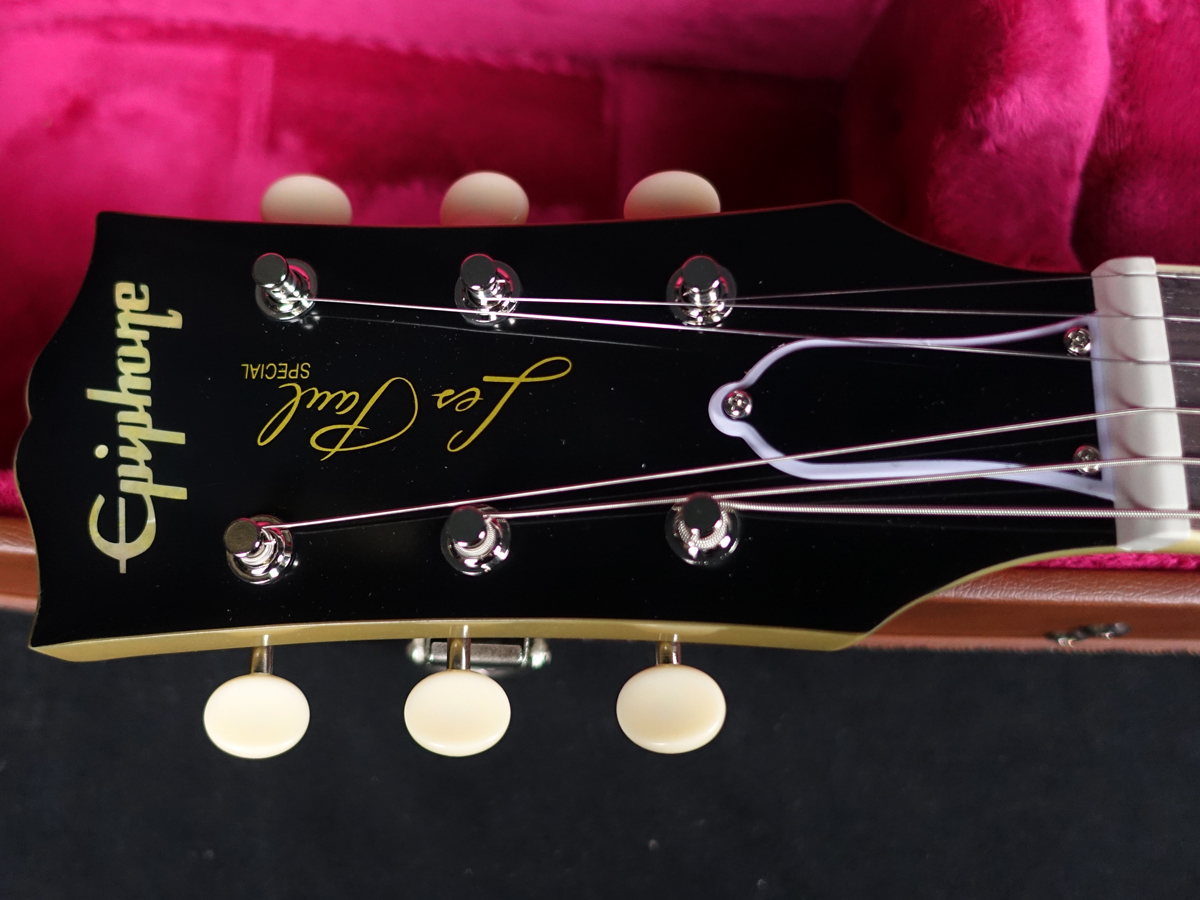 ギブソン・スタイルの“オープンブック”ヘッドストックには、Epiphone Deluxe 3連チューナー(ホワイトボタン付き)を搭載。