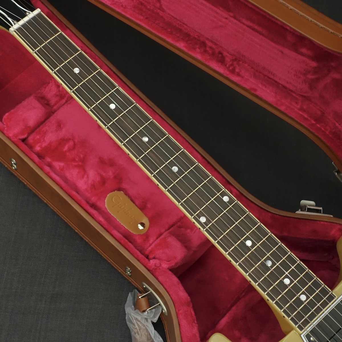 外張りがブラウン色で内張りがピンク色のヴィンテージスタイルのハードケースが付属します。