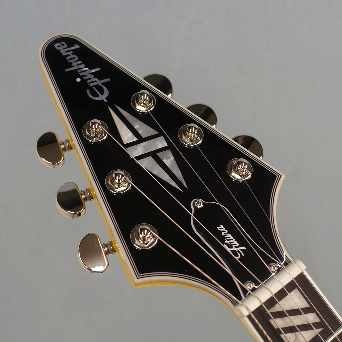 Futura Flying V Customのエレクトロニクスには、エピフォンの新しいProBucker™ Igniteハムバッカー™を搭載し、明瞭さと解像度を保ちながらパワフルなトーンを放ちます。2つのプッシュ/プル・ボリューム・コントロールによりコイルタップが可能で、さらにプッシュ/プル・トーン・コントロールによりフェイズの切り替えができるため、音の柔軟性がさらに高められています。ステージや画面上で目を引く2種類の見事なクロマシフト・フィニッシュ(クイックシルバー・シフト、ソラリス・シフト)をラインナップ。モダンな美学、汎用性の高い電子回路、あるいはパフォーマンスに応える楽器を求めるプレイヤーに、Futura Flying V Customは応えます。
