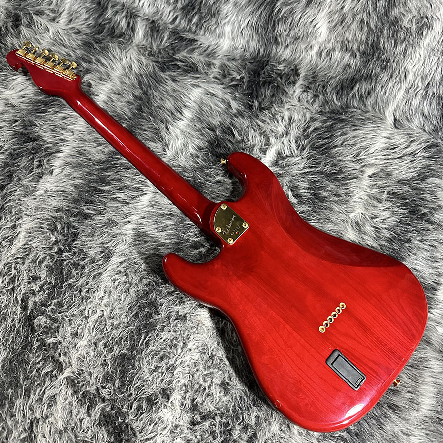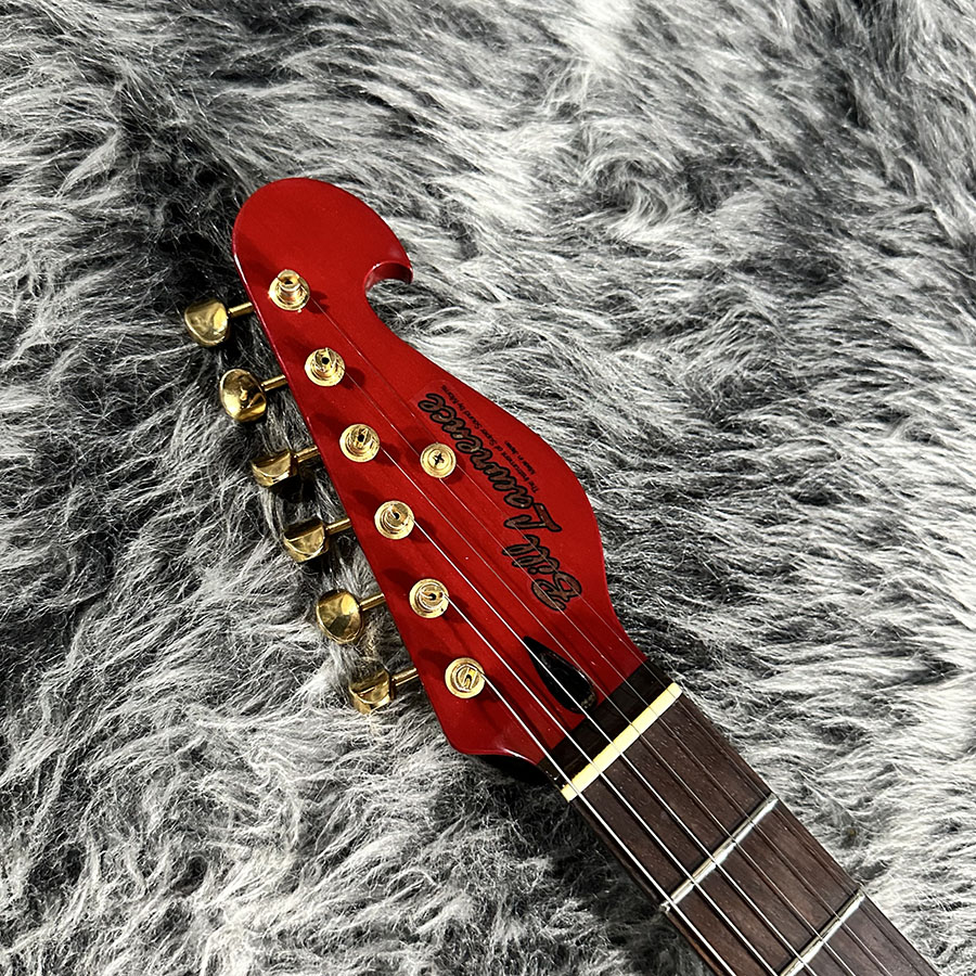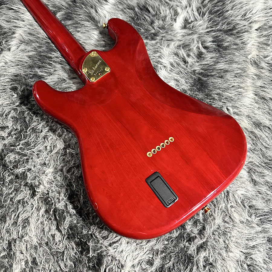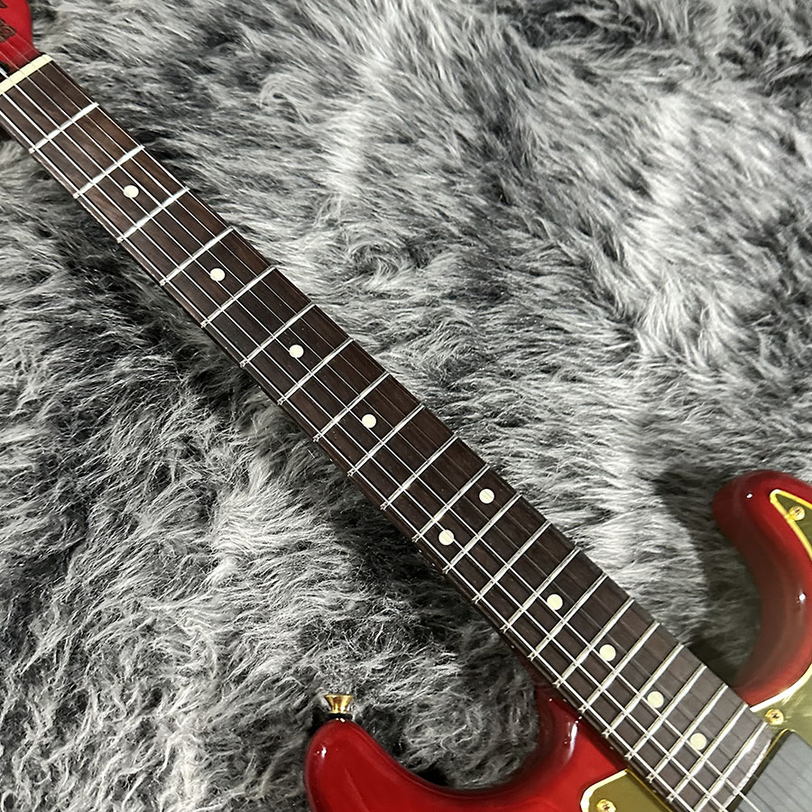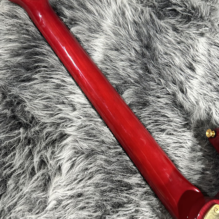 レッドのシースルーカラーにミラーゴールドのピックガードが映える存在感のある1本です。