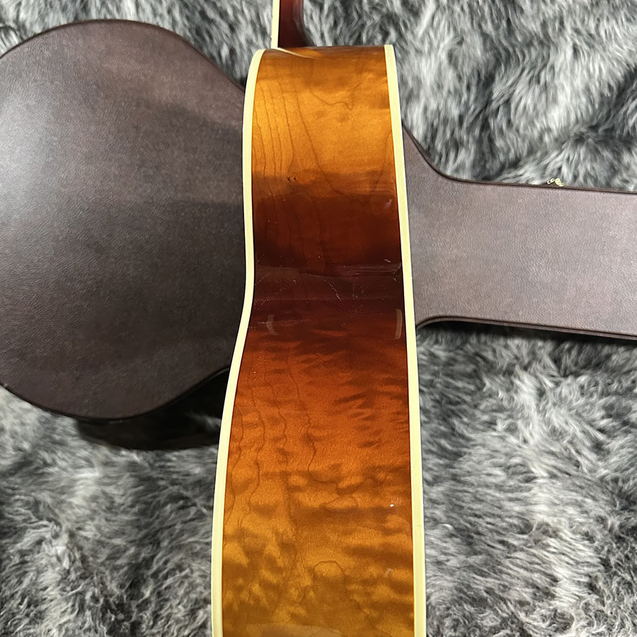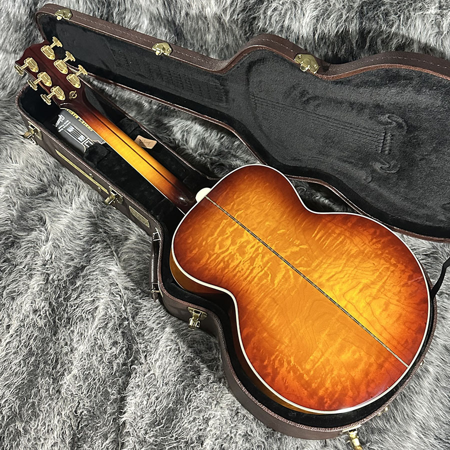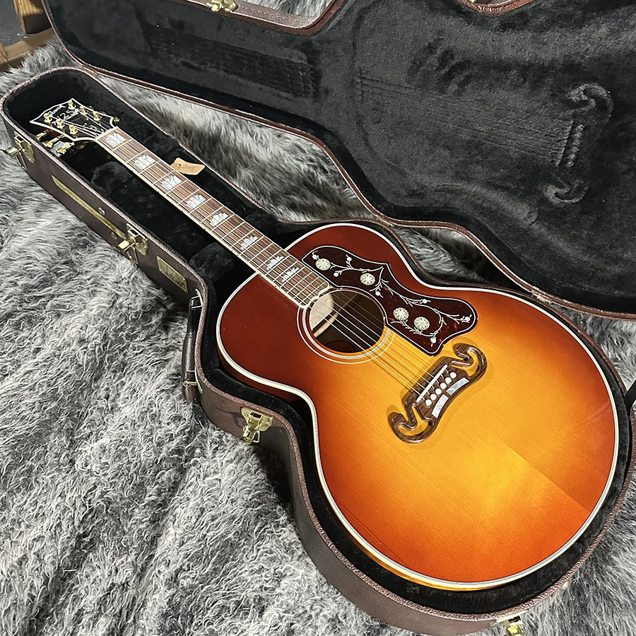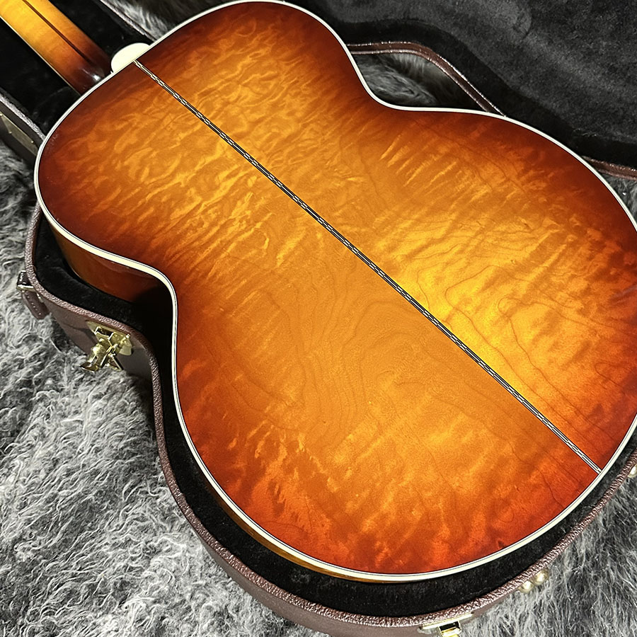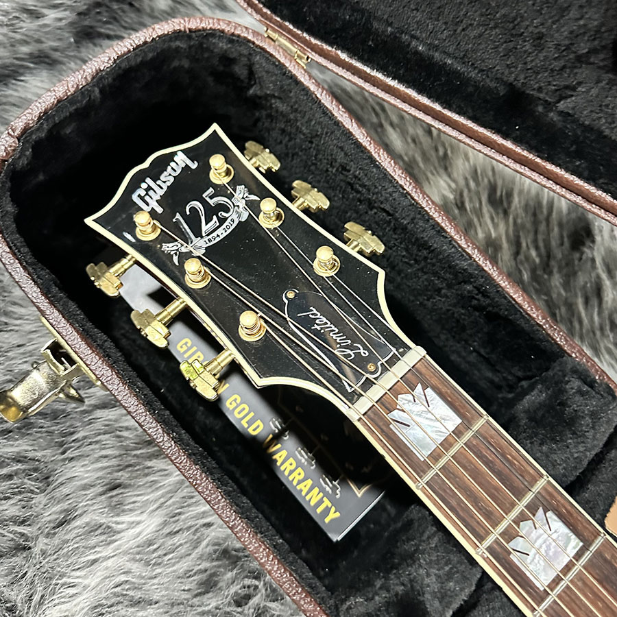 トップ材にLutz Spruce、サイドバックにQuilted Mapleを使用。ヘッドにあしらわれた125thインレイが美しく、SJ200らしい厚みのある低音域からメリハリのある高音域まで、ダイナミックでありながら決して暴れすぎる事のないバランスの良いサウンドの1本です。