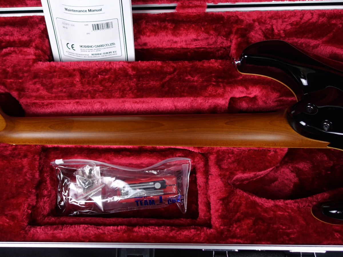 ウッドマテリアルはボディ・トップには4mm厚のフレイム・メイプル材、バックにはバスウッド材を採用、ネックには窒素加熱処理技術である”エステック処理”されたメイプル材を使用。