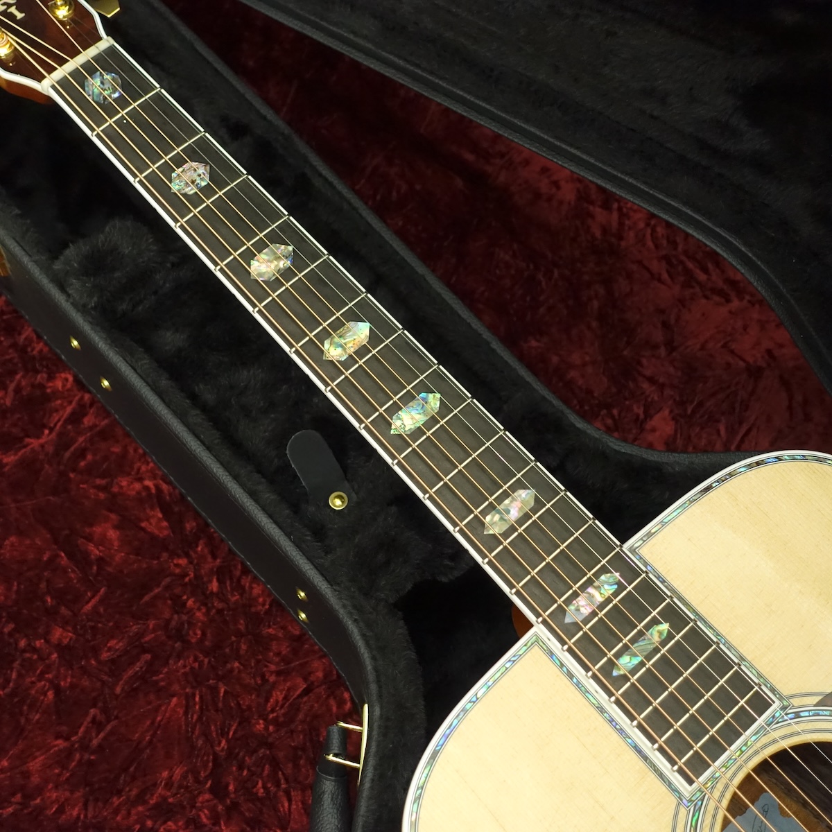 ソリッドスプルーストップ、ハカランダラミネイトサイド&バックのボディにマホガニーネック、エボニーフィンガーボードをセットしたウッドマテリアル。