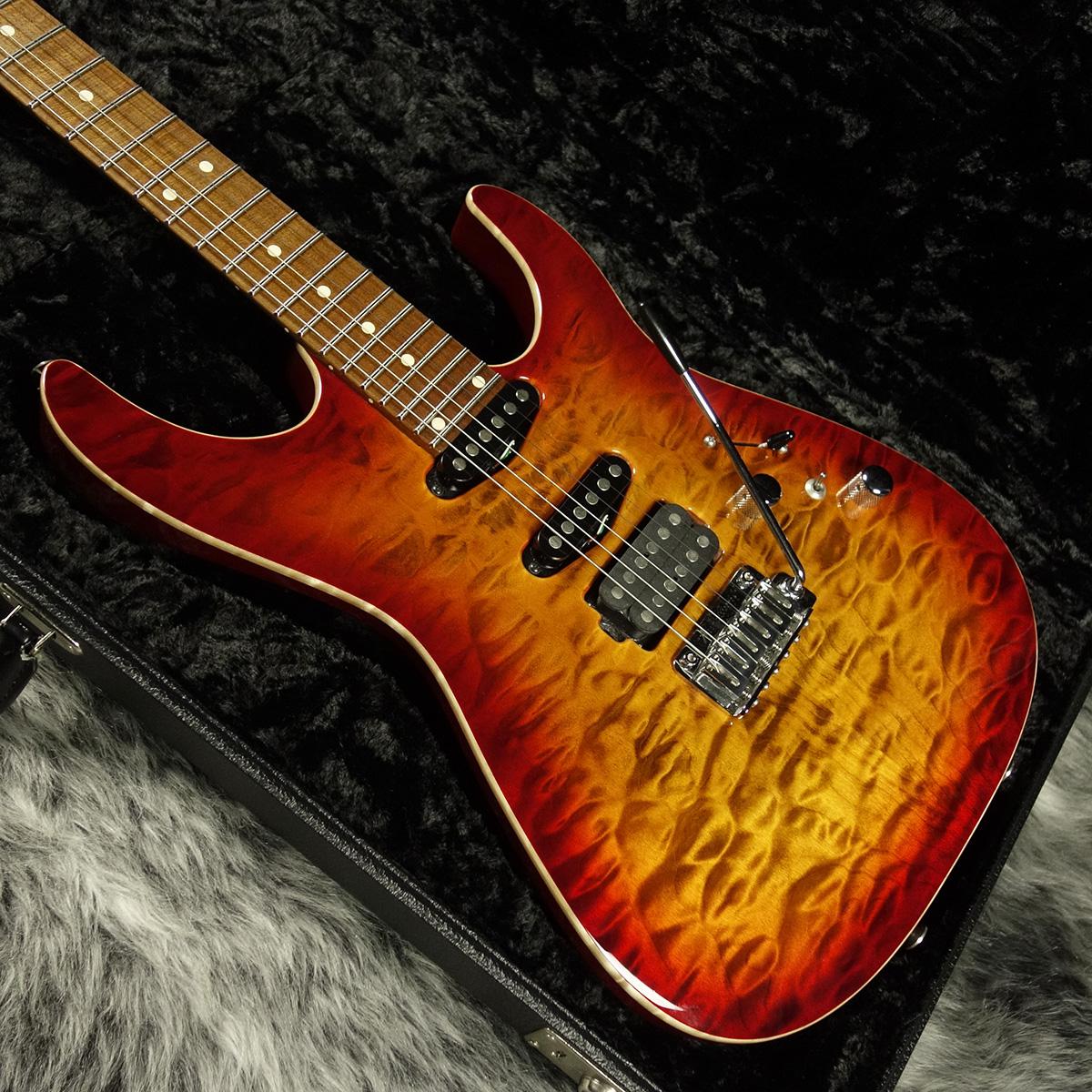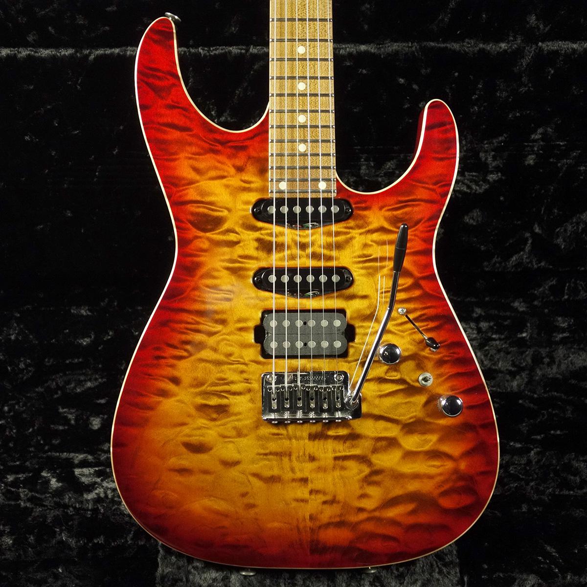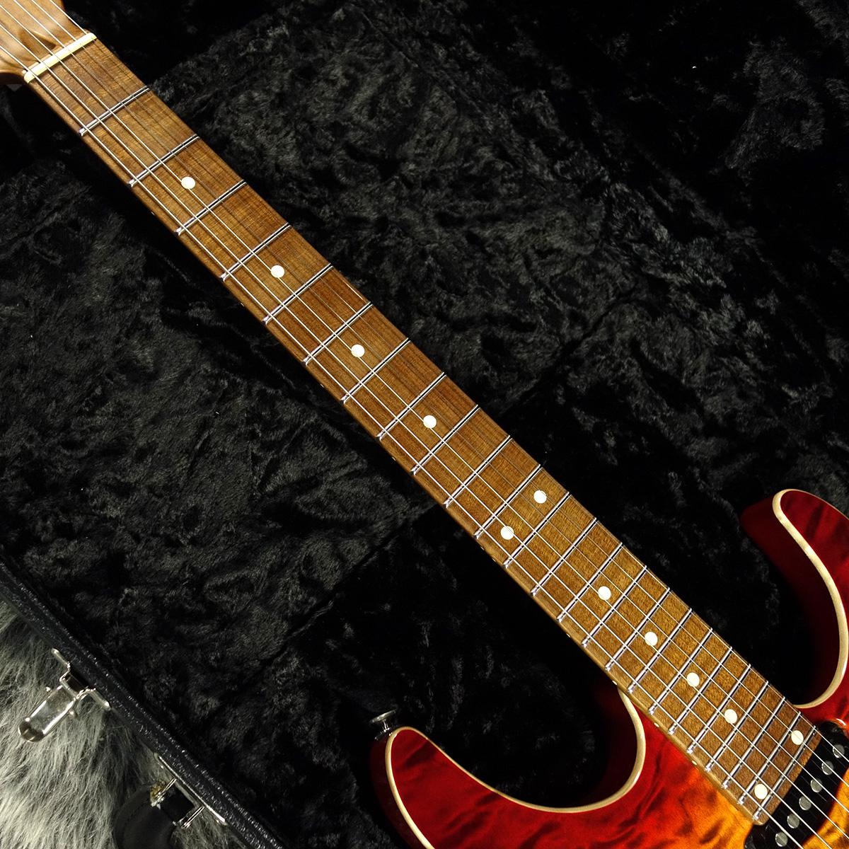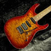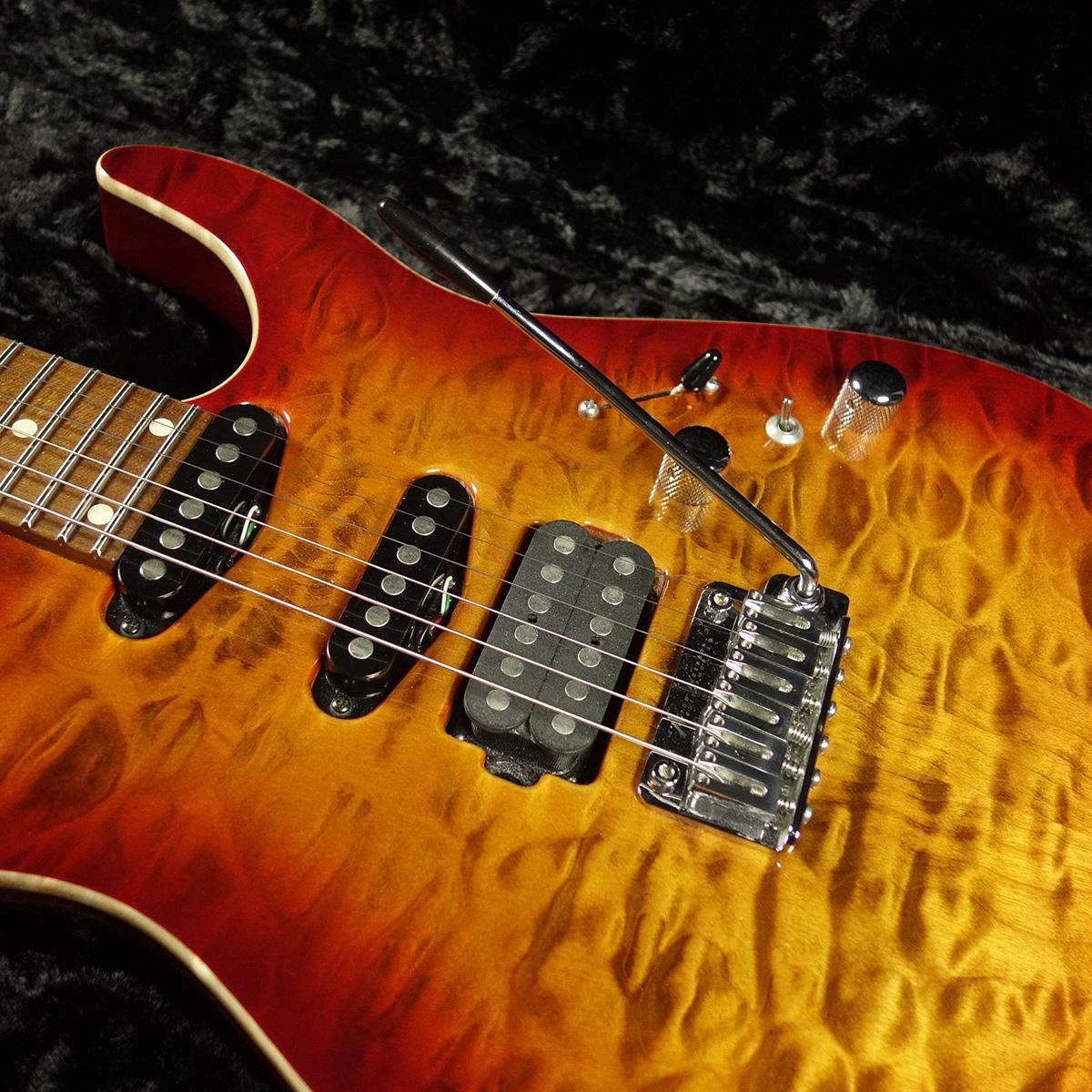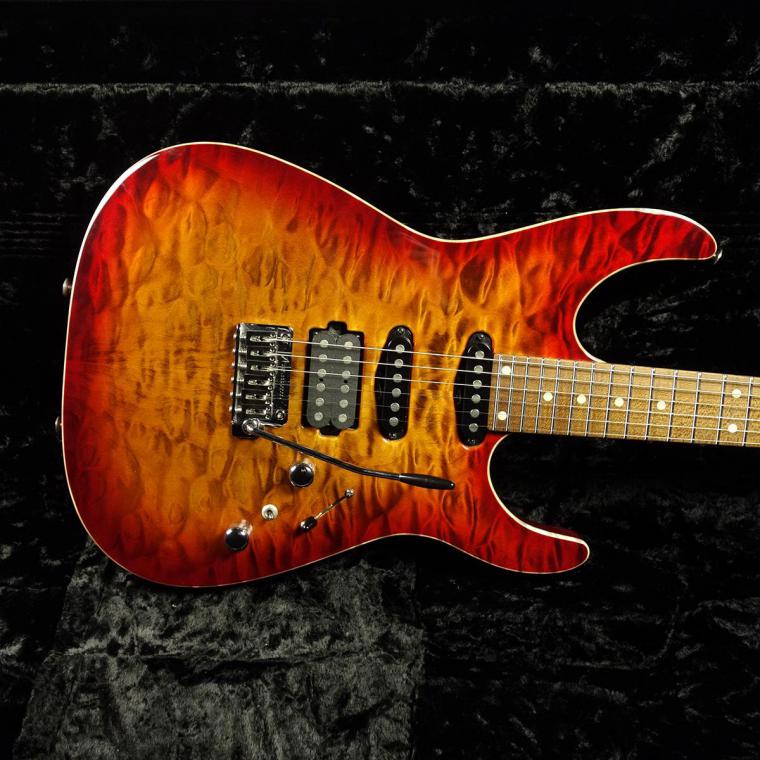 エキゾチックなキルトメイプルトップにアルダーバックのボディーは一見ドロップトップと同様のシェイプに見えますがカッタウェイを深くしてホーンも長くとり、最高フレットまでの容易なアクセスを可能にしました。