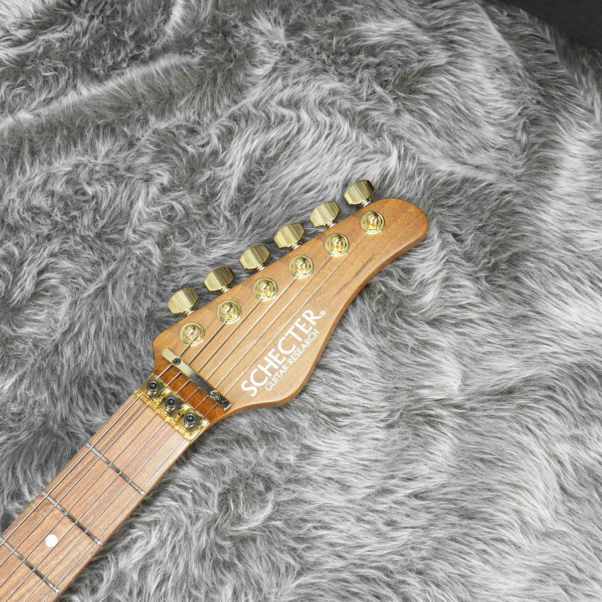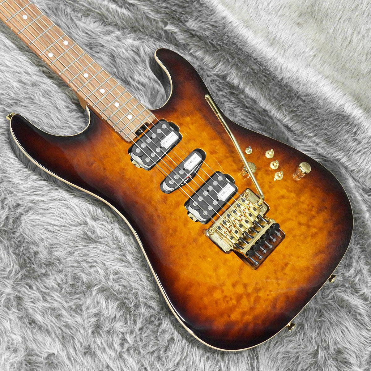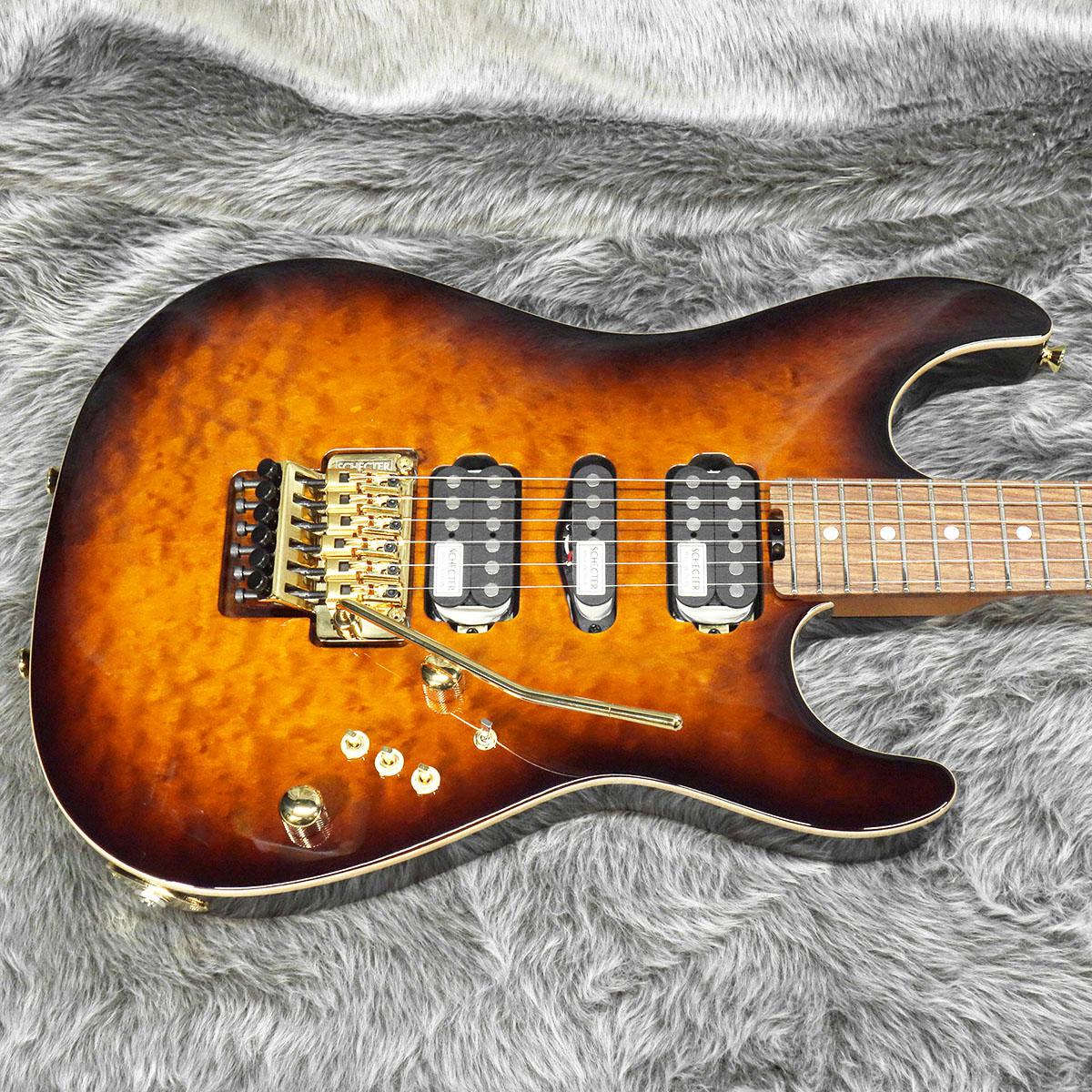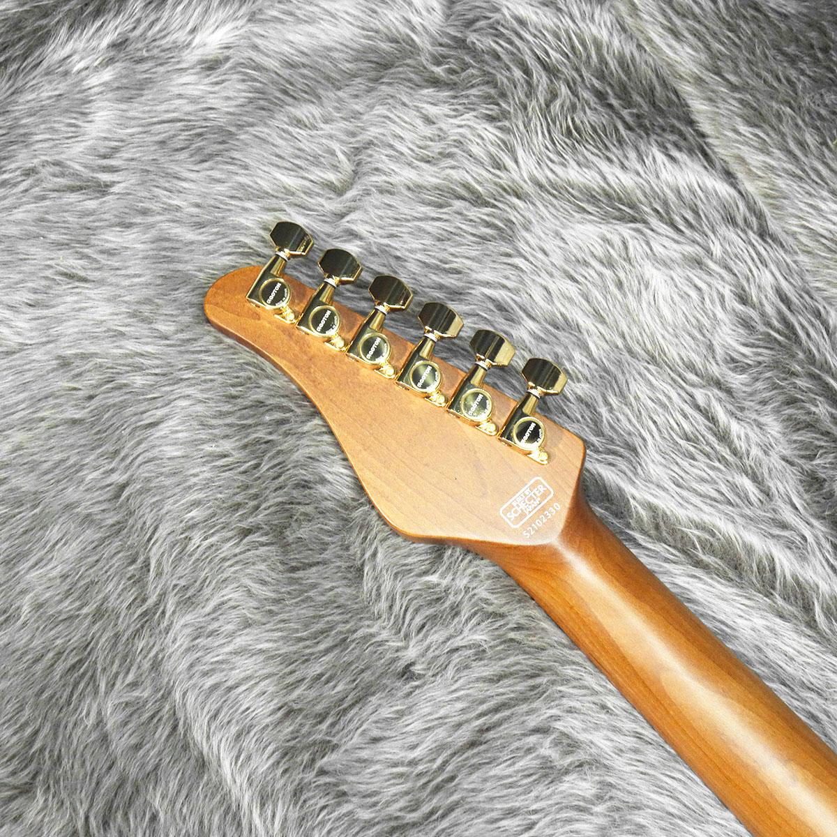 美しいキルトメイプルのラミネイトをトップにあしらったメイプルトップ、アルダーバックのボディ&パーフェロー指板のローステッドメイプルネックというウッドマテリアル。