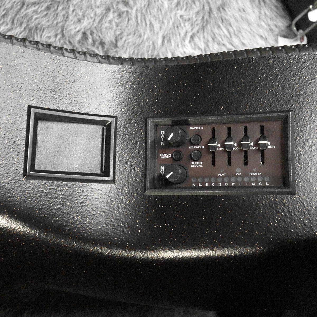 1995年製の本機は、トップの落ち込み(トップ落ち)が見受けられる以外は非常に良好なコンディションをキープしている一本です。そのトップ落ちもオベーションにはよく見られるもので、現状ブリッジやブレーシングへの影響は見られませんので問題ないでしょう。フレットはローフレットに減りが見られますが、まだまだ気にすることなくお使い頂けます。ありがちなトラスロッドが締め切ってあるという事もなく、今後のメンテナンスも可能です。プリアンプはOPTIMAと搭載しています。こちらも殆どの中古品に見られるチューナーの動作不良がございます。他の機能には問題ございませんが、メーカーでも修理や交換等の対応が不可ということ予めご了承ください。バランスアウトプットジャックの止めねじ2本はどこかのタイミングで変えられているのか、長さの少し違うものがついています。ガタツキ等はなく取り付けには 問題ありません。